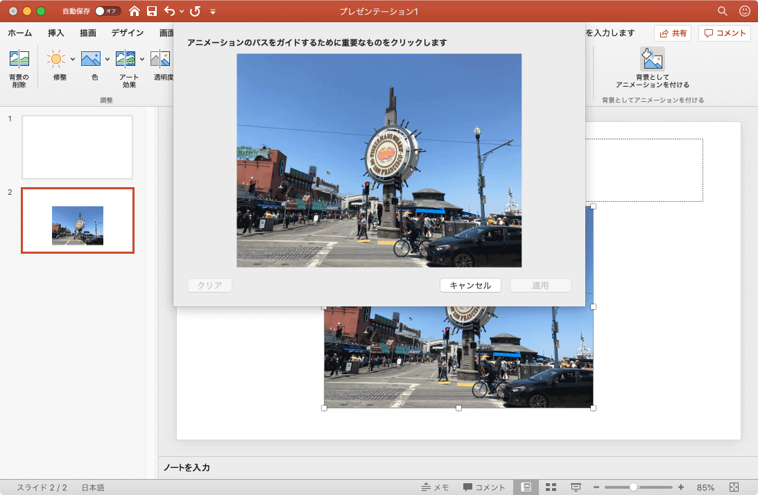 Office 365でインストールされたPowerPoint for Macに限り、選択した図をスライドの背景としてアニメーションを付けることができるようになりました。スライドにアニメーションの背景を使用することで、視覚的により興味深い効果をプレゼンテーションに加えることができます。対象となる図を選択して[図の書式設定]タブを開き、[スライドの背景としてアニメーションを付ける]をクリックします。