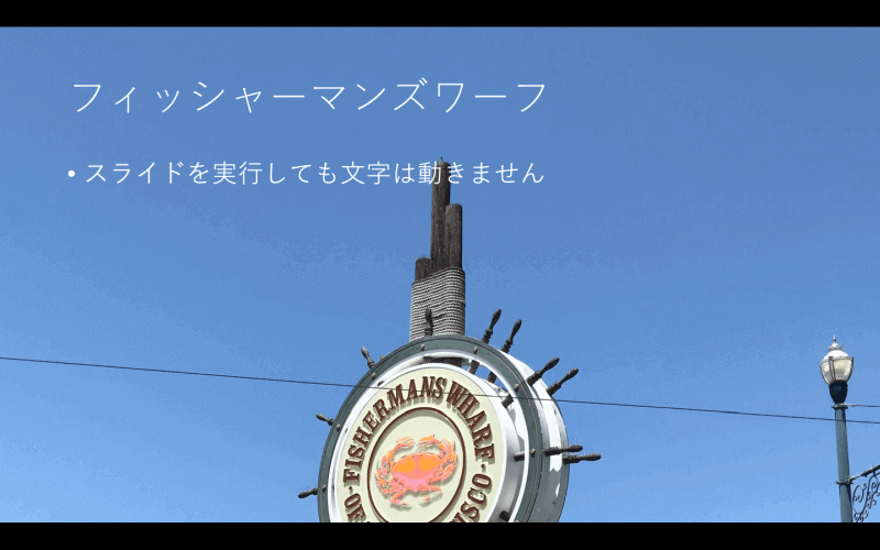 - スライドショーを実行すると、スライドの背景がズームアップします。テキストやその他のコンテンツをスライドの背景にかぶさるように追加することができます。追加したコンテンツは、背景が動いても、所定の位置に表示されたままとなります。
