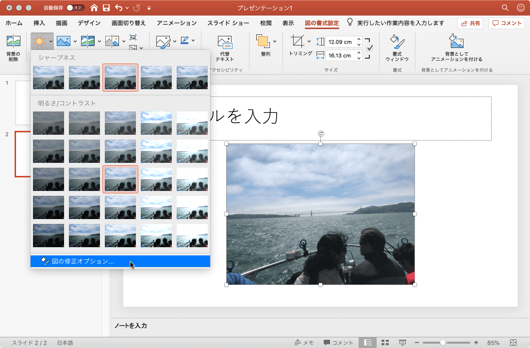 - [調整]グループの[修整]をクリックして、一覧から[図の修正オプション]を選択します。