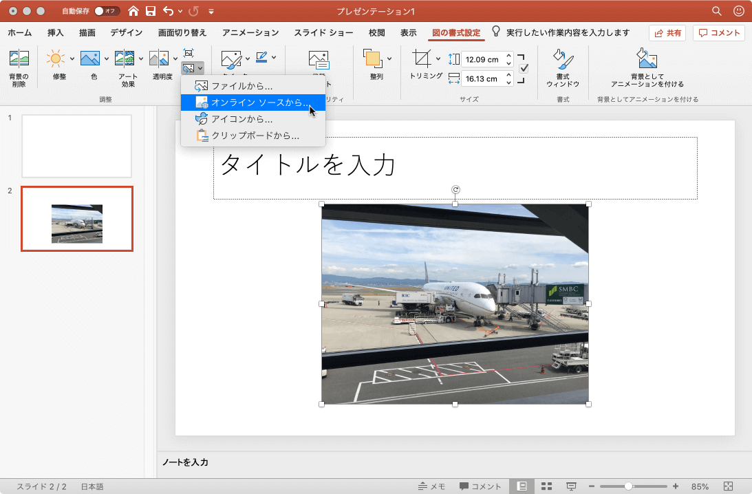 図オブジェクトのサイズと位置を保持して、選んだ図を削除または置き換えるには、画像を選択して[図の書式設定]タブを開き、[画像の変更]から置換したい画像を選択します。置き換える画像は[ファイルから][オンライン ソースから][アイコンから][クリップボードから]の4パターンから選択できます。