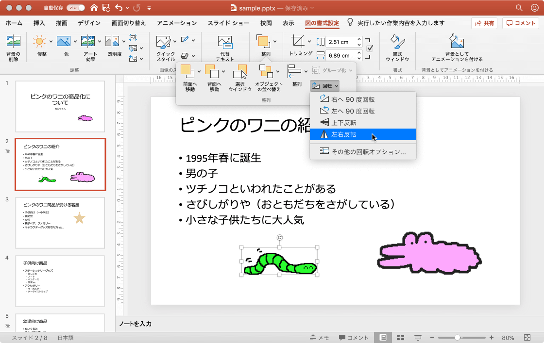 - [整列]グループの[回転]をクリックして、[左右反転]を選択します。