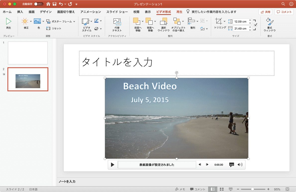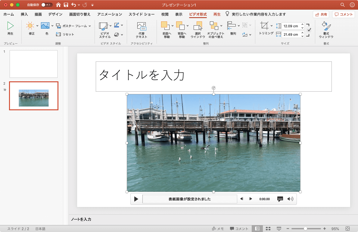 ビデオを選択し、[ビデオ形式]タブを開いて、[調整]グループの[ポスターフレーム]一覧から[ファイルから画像を挿入]を選択し、ポスターフレームにしたい画像を選択します。再生中、ポスターフレームにしたいフレームで停止させて、そのフレームに設定することも可能です。