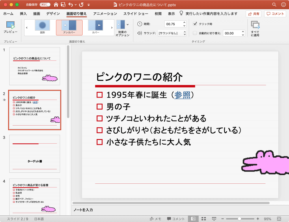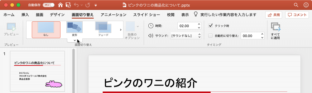 - スライド切り替えがプレビューされてスライドに画面切り替え効果が追加されると、スライドの近くに