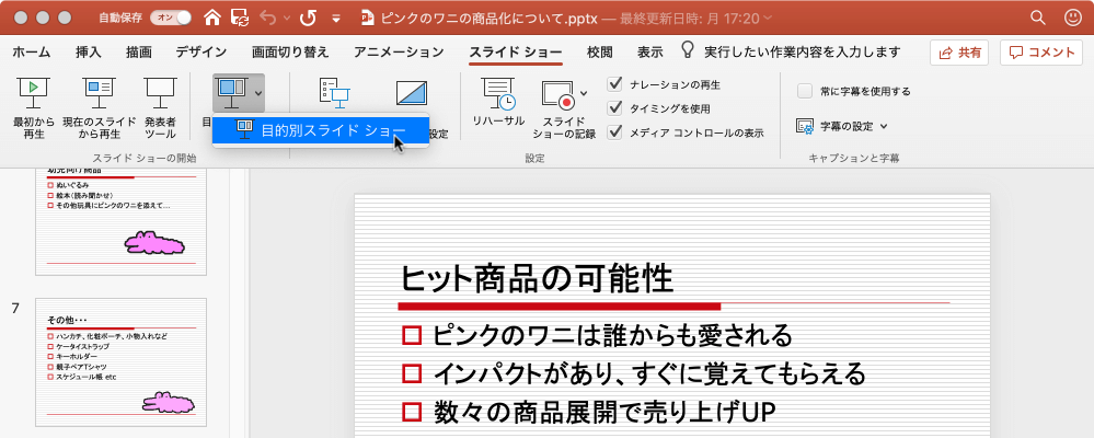 - [スライドショー]タブを開き、[目的別スライドショー]をクリックして[目的別スライドショー]をクリックします。