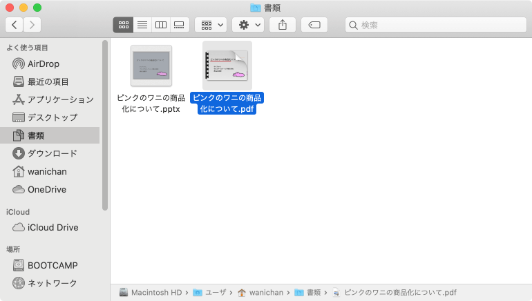 - [ファイル形式]一覧から[PDF]が選択されていることを確認し、適宜名前を変更して、[エクスポート]ボタンをクリックします。