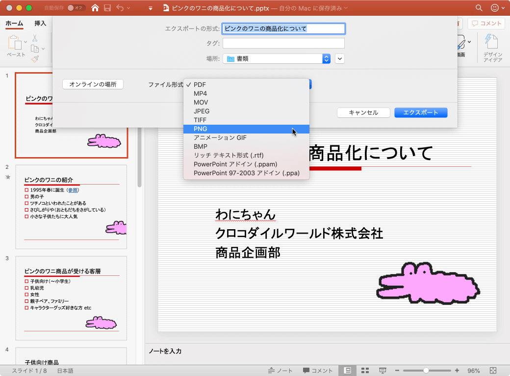 それぞれスライド単位で図のファイルとして保存するには、フルカラーの図に適したPNG形式を選択すると品質バランスが取れていいでしょう。[ファイル]メニューの[エクスポート]を選択し、[ファイル形式]一覧から[PNG]を選択します。