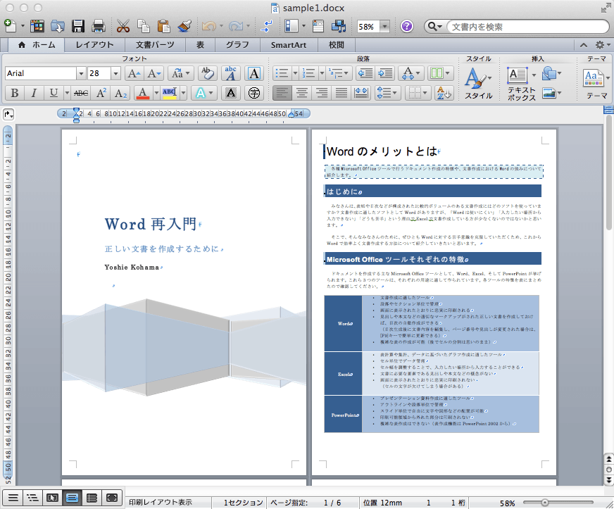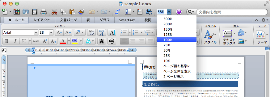 Word 2011のズーム機能を使って、ドキュメントの表示倍率を変更することができます。ステータスバーのズームスライダーを利用して簡単に表示の拡大・縮小も行えます。