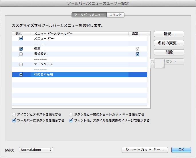 Word 2011でよく使うコマンドを自分でツールバーに登録するためのツールバーを作成することもできます。[ツールバー/メニューのユーザー設定]ダイアログボックスの[新規]ボタンをクリックして、ツールバーの名前を入力します。