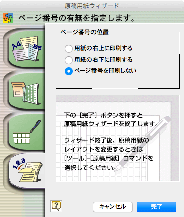 - ページ番号の有無を指定して[完了]ボタンをクリックします。