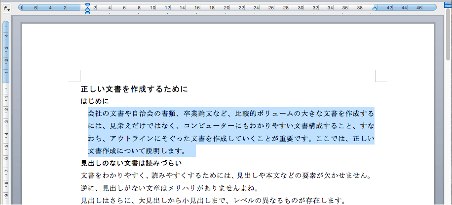 - 選択された段落に対して、1文字分インデントレベルが上がりました。
