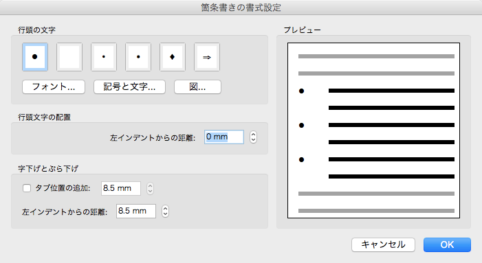 - [箇条書きの書式設定]ダイアログボックスのプレビューが変更されたことを確認して[OK]ボタンをクリックします。