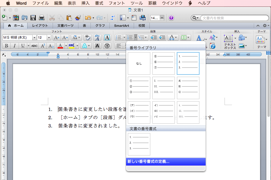 段落番号のスタイルが一覧にない場合は、Word 2011で新しく書式を定義することができます。行頭文字を変更したり、たとえば「手順1」「手順2」…のように段落番号の前に任意の文字を入れたりできます。