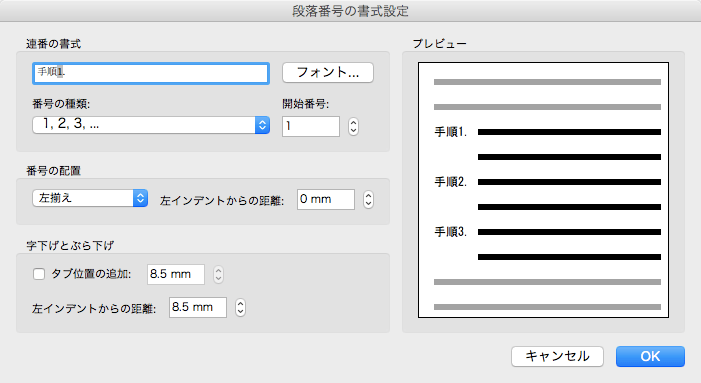 段落番号「1,2,3…」を「手順1,手順2,手順3…」に変更する