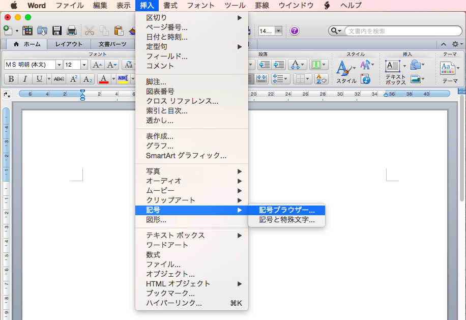 - [挿入]メニューの[記号]をポイントして[記号ブラウザー]をクリックします。
