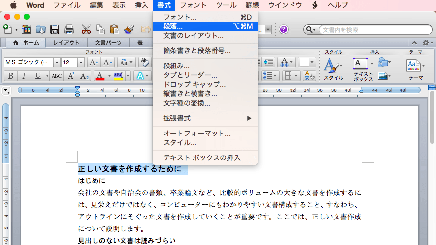 - 対象となる段落を選択するかその段落内にカーソルを移動して[書式]メニューの[段落]を選択します。