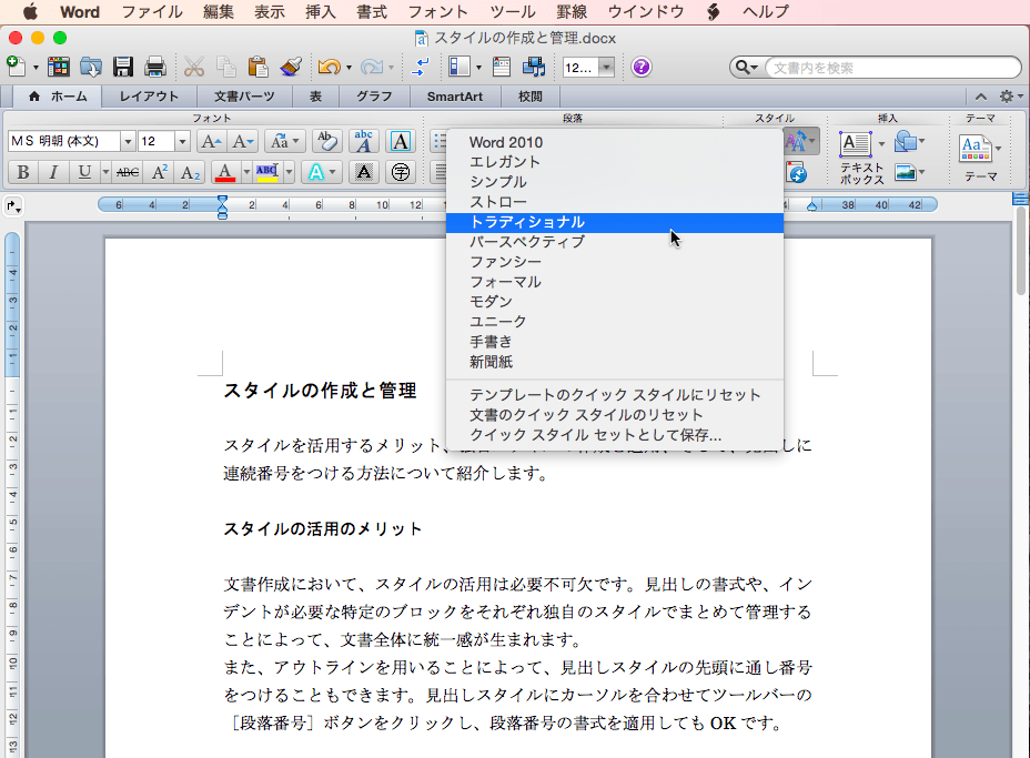 - [スタイルセット]一覧から任意のスタイルを選択します。ここでは[トラディッショナル]を選択します。