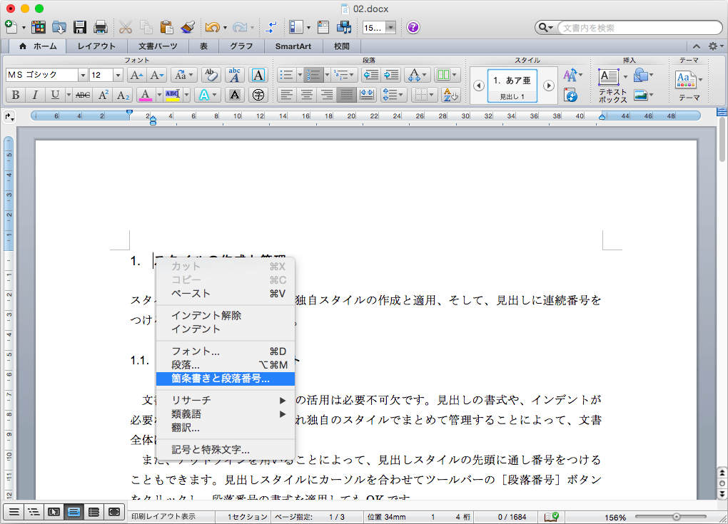 - 変更したい見出しの番号部分を右クリックして、ショートカットメニューより[箇条書きと段落番号]を選択します。
