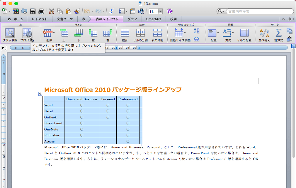 - [表のレイアウト]タブを開き、[表]グループの[プロパティ]をクリックします。