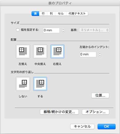 - [表のプロパティ]ダイアログボックスの[表]タブを選択します。