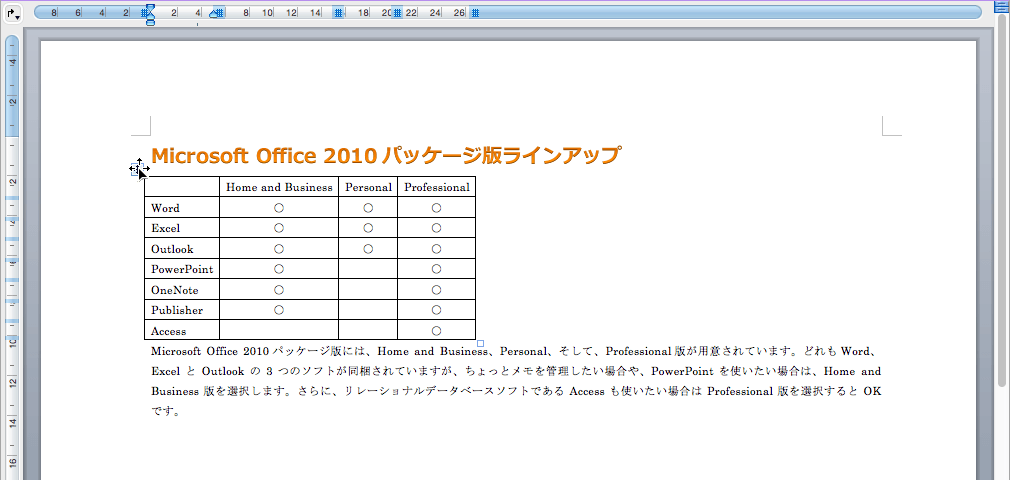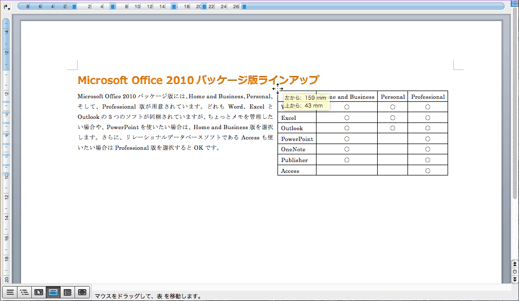 表の周りに文字列を折り返すには、[表のプロパティ]ダイアログボックスで設定するか、マウスで配置したい場所までドラッグします。
