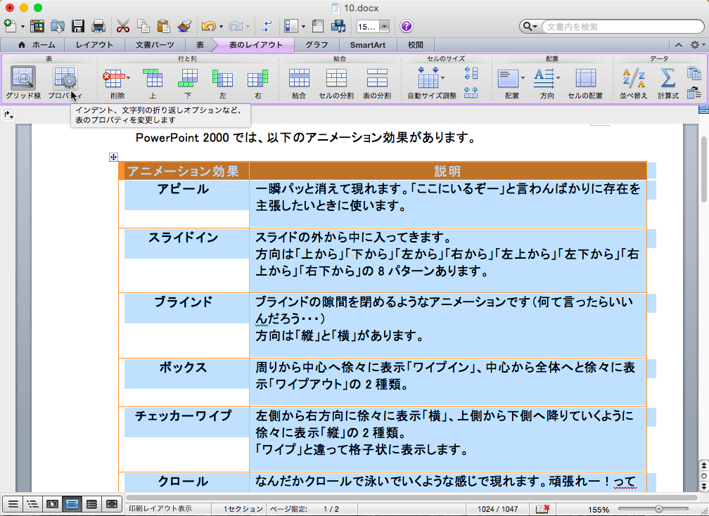 - [表のレイアウト]タブを開き、[表のプロパティ]をクリックします。