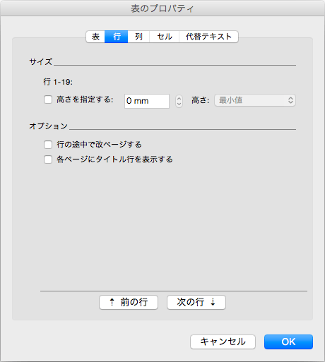 - [表のプロパティ]ダイアログボックスの[行]タブを開き、[行の途中で改ページする]のチェックをはずして[OK]ボタンをクリックします。