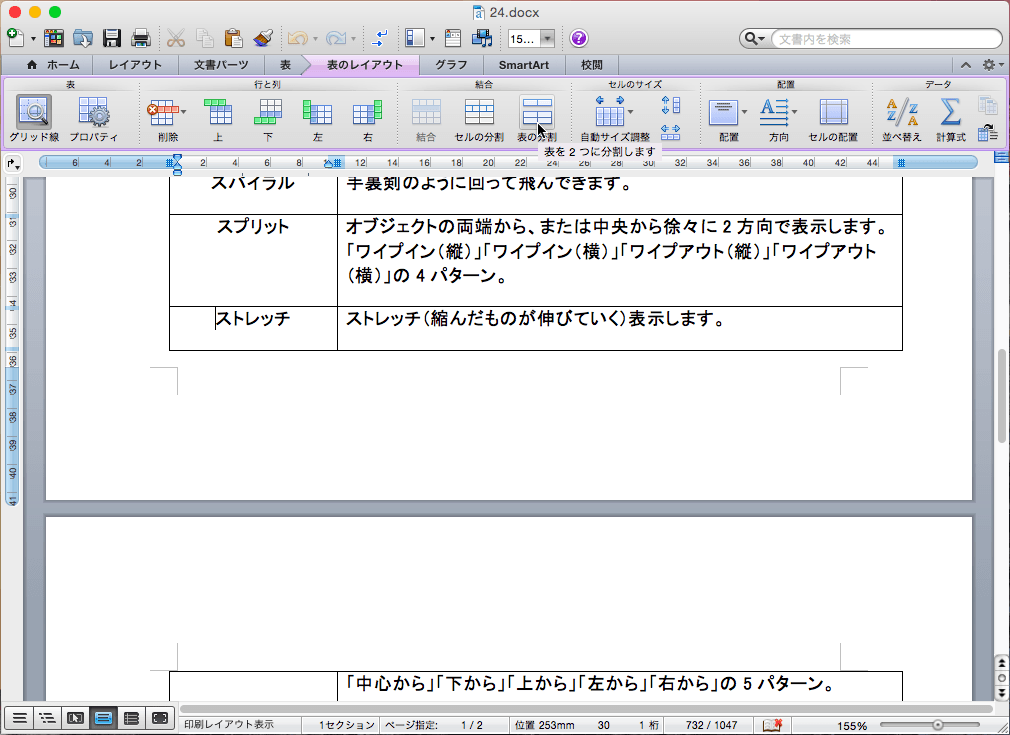 表を二つに分割するには、表を分割する次のセルにカーソルを移動して表の分割コマンドを選択します。