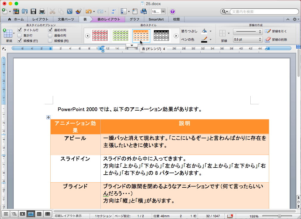 - サンプルファイルを開き、表のスタイルを[表(オレンジ4)]を選択します。