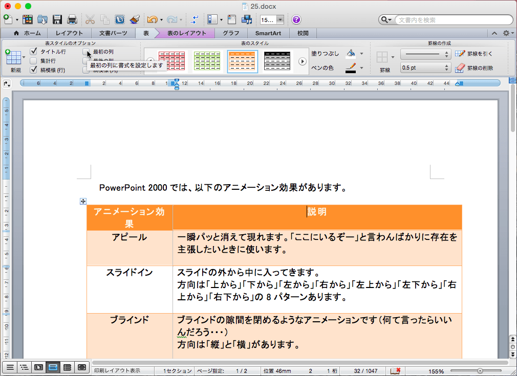 - [表ツール]の[デザイン]タブの[表スタイルのオプション]グループから[最初の列]のチェックを外すと、最初の列の文字列の太字が解除されます。