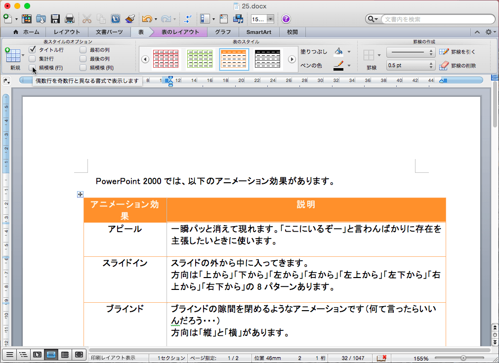 - [縞模様(行)]のチェックを外すと、縞模様のスタイルが解除されます。