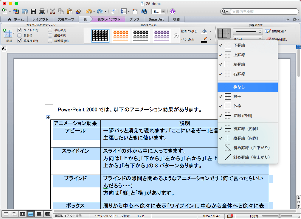 表のスタイルをクリアにするには、表内にカーソルを移動し、[表]タブをクリックし、表のクイックスタイル一覧から[標準の表]を選択して、[罫線]一覧から[枠なし]を選択します。