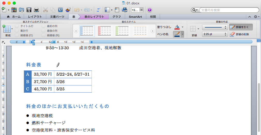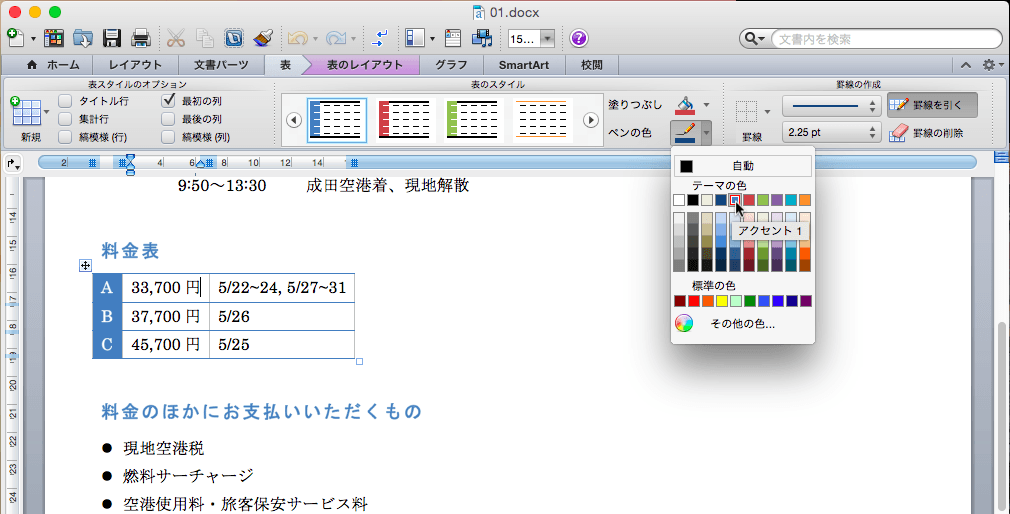 ここでは、サンプルファイルを使い、「旅行代金」の上下の辺に2.25ptの太さの「青、アクセント1」の色の実線を引く方法について説明します。