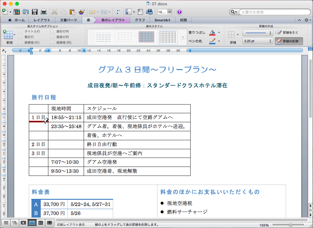 複数のセルを結合したい時などの場合、マウスで罫線を消すこともできます。対象となる表内にカーソルを移動し、[表]タブをクリックして、[罫線を引く]グループの[罫線の削除]をクリックします。すると、マウスの形状が消しゴム