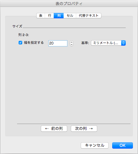 - [表のプロパティ]ダイアログボックスの[列]タブを開きます。