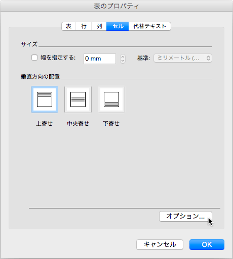 - [表のプロパティ]ダイアログボックスの[セル]タブを選択します。