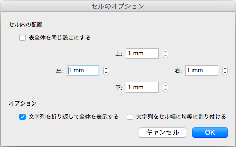 - [セルのオプション]ダイアログボックスの[表全体を同じ設定にする]のチェックを外します。