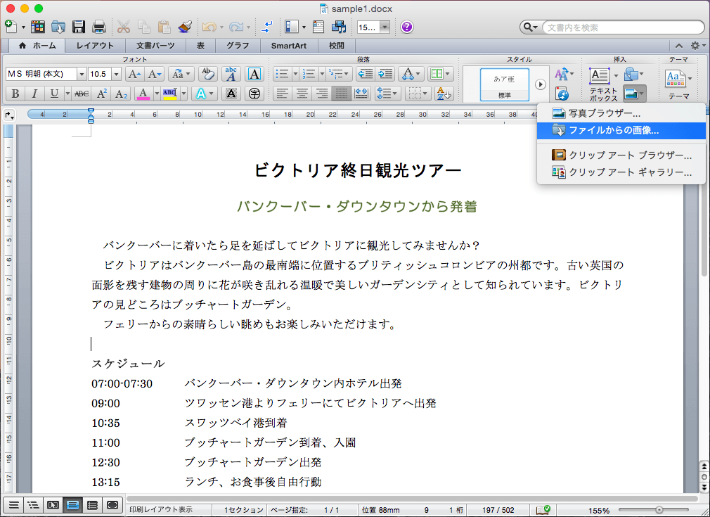 [ホーム]タブの[挿入]グループの[図]ボタンをクリックして、[ファイルからの画像]をクリックします。