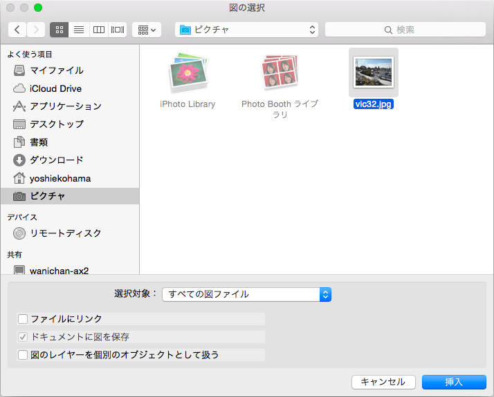 - [図の挿入]ダイアログボックスが表示されたら、vic32.jpgファイルを選択して[挿入]ボタンをクリックします。