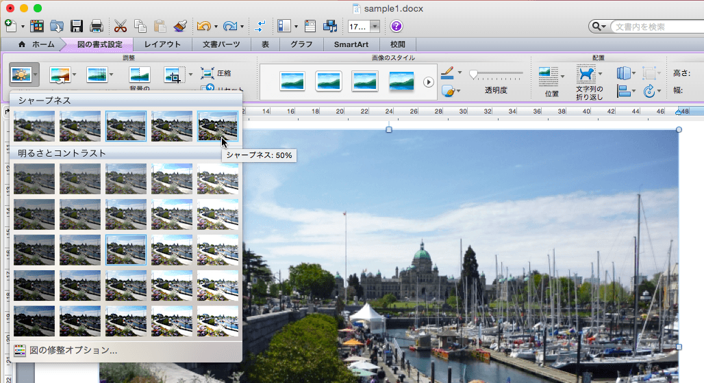 挿入した図の明るさやコントラスト、または鮮明度を調整するには、対象となる図を選択して[図の書式設定]タブを開き、[調整]グループの[図を修整]をクリックして、一覧から選択します。