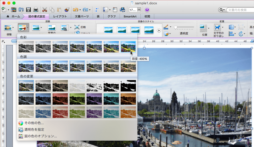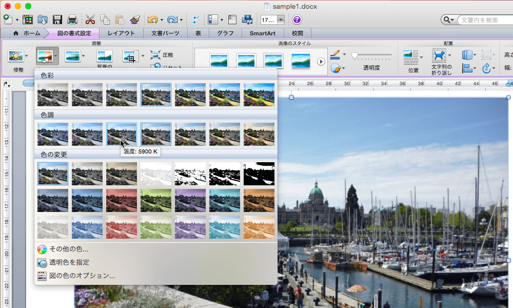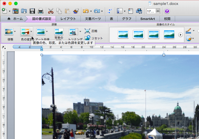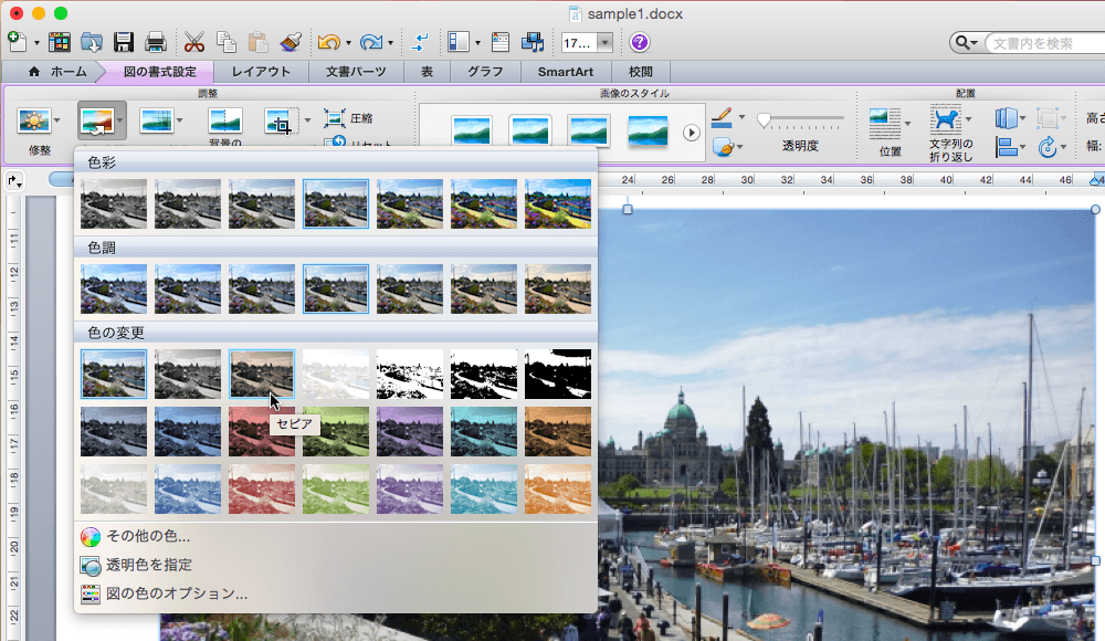 - [調整]グループの[色]をクリックし、[色のトーン]一覧から選択します。