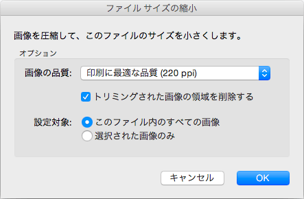- [ファイルサイズの縮小]ダイアログボックスで、画像の品質や設定対象等を選択して[OK]ボタンをクリックします。