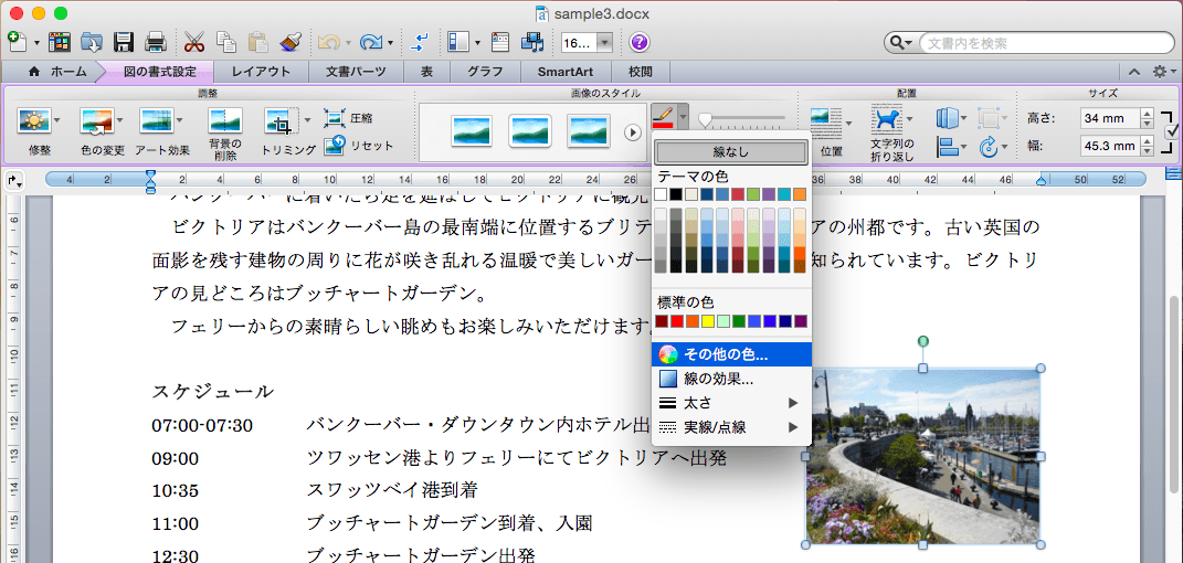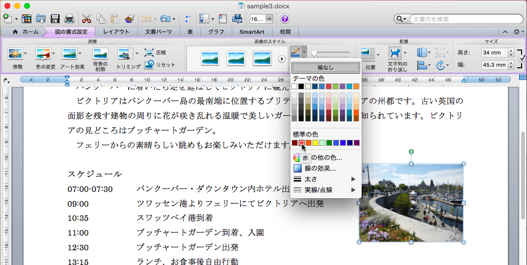 既定では0.75ptの太さの実線で枠線を付けることができます。[図の枠線]ボタンの左側をクリックすると、選択された色で枠線を引くことができます。他の色を指定するには、以下の手順に従います。