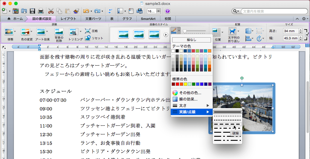 図を選択し、[図の書式設定]タブを開いて、[画像のスタイル]グループから[図の枠線]をクリックし、枠線の色や太さ、実線/点線を選択します。