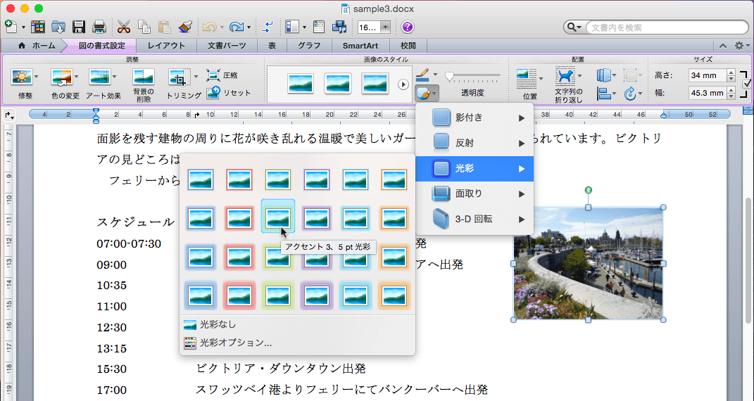 Word 2011に組み込まれている図の効果は以下の通りです。図のクイックスタイル一覧にはない効果を適用したい時に利用します。
