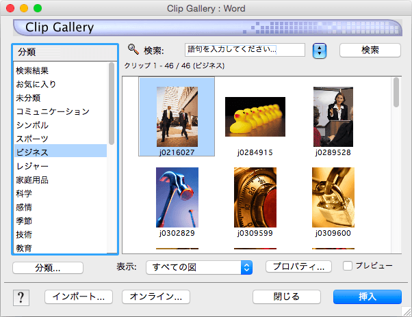 - クリップギャラリーが開いたら、挿入したい画像を選択し、[挿入]ボタンをクリックします。