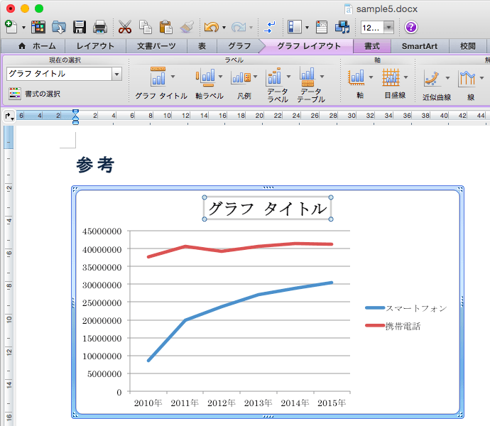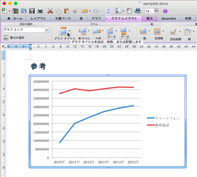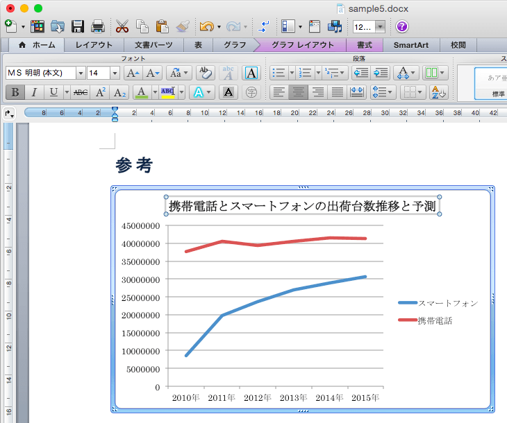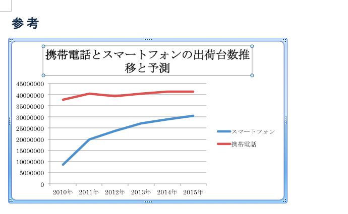- グラフタイトルラベルが表示されたので、グラフタイトルにする文字列を入力します。ここでは、「グラフ タイトル」の文字列を消して、「携帯電話とスマートフォンの出荷台数推移と予測」と入力します。