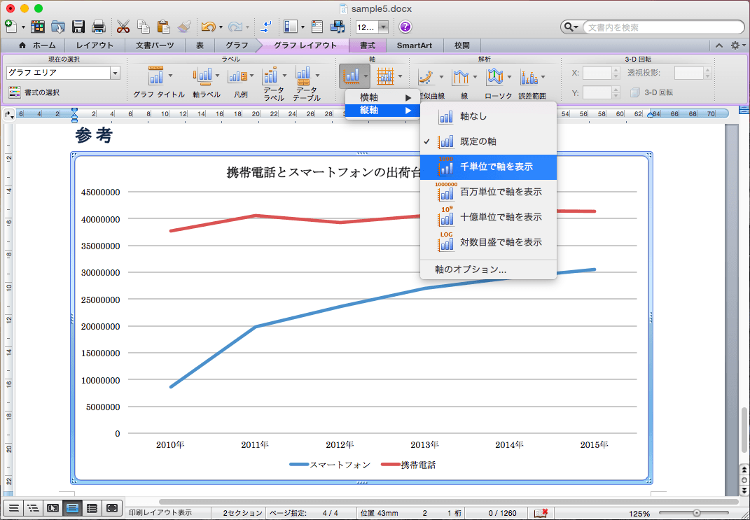 - [軸]グループの[主縦軸]をポイントし、[千単位で軸を表示]をクリックします。