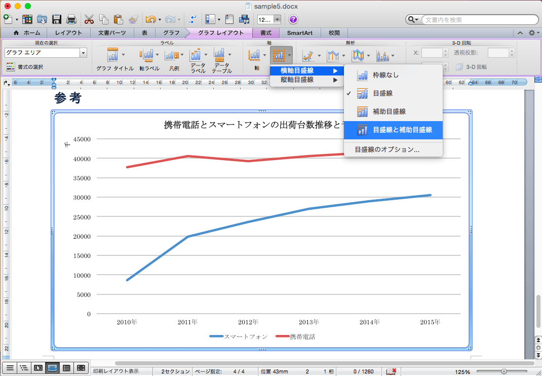 - [軸]グループの[目盛線]をクリックし、[主横軸目盛線]をポイントして[目盛線と補助目盛線]をクリックします。