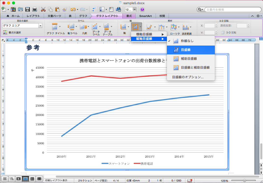 各軸の書式設定や、目盛り線の表示・非表示を設定するには、[グラフ]の[グラフ レイアウト]タブを開き、[軸]グループで設定できます。