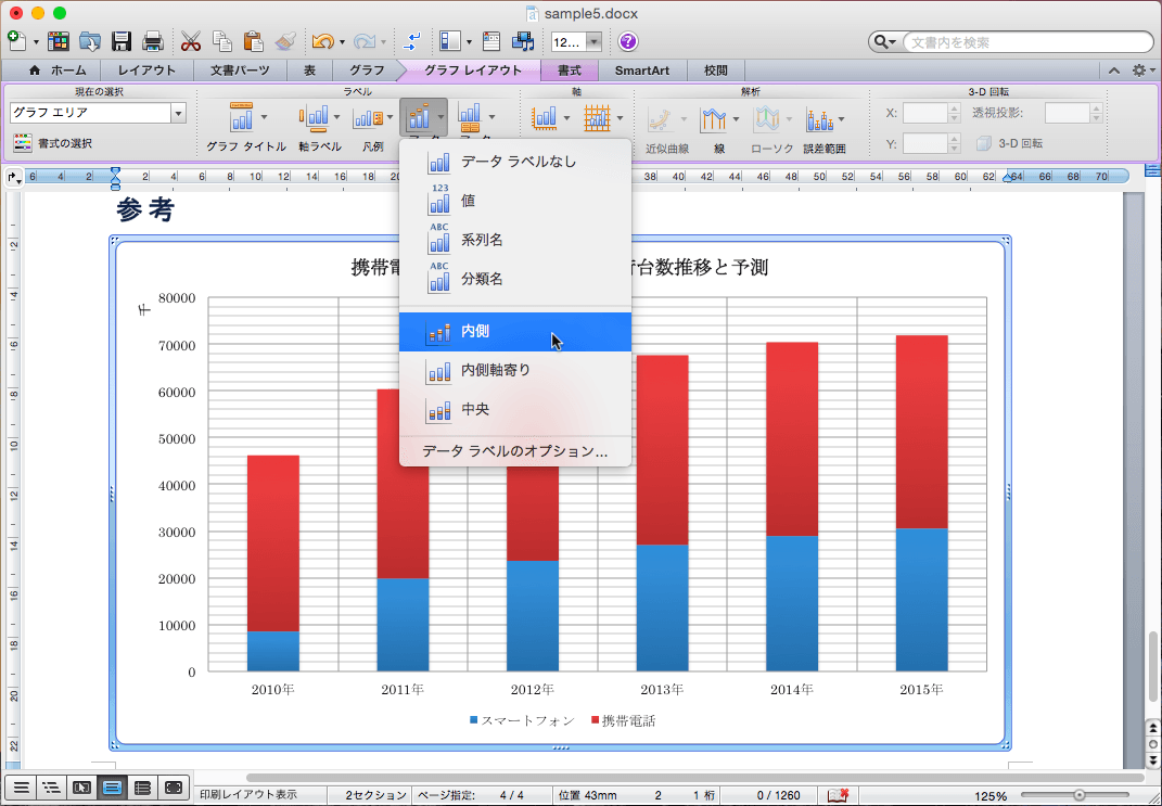 データラベルをデータ要素の端の内側に表示するには、以下の手順に従います。